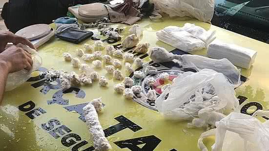 Ao recuperar a bolsa a polícia encontrou, 1.186 pedras de crack, uma bolsa com pedras de crack, quatro pedras grandes de crack, 25 bombinhas de maconha, duas trouxas grandes com cocaína e mais 26 trouxinhas da mesma droga.