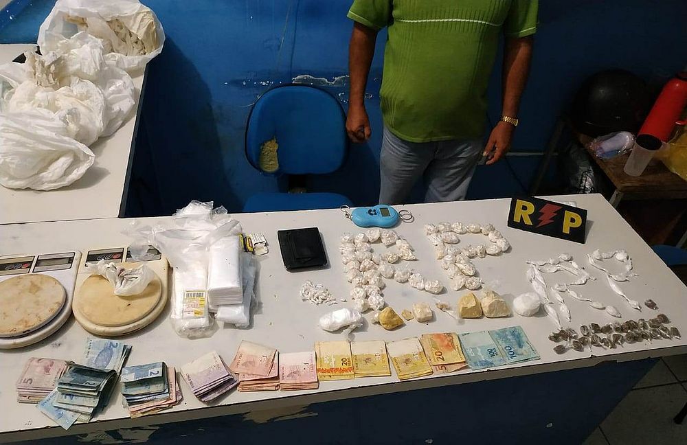 Além disso, a polícia também encontrou várias sacolinhas plásticas para empacotamento de drogas, três balanças de precisão e R$ 1.195,00 em dinheiro.