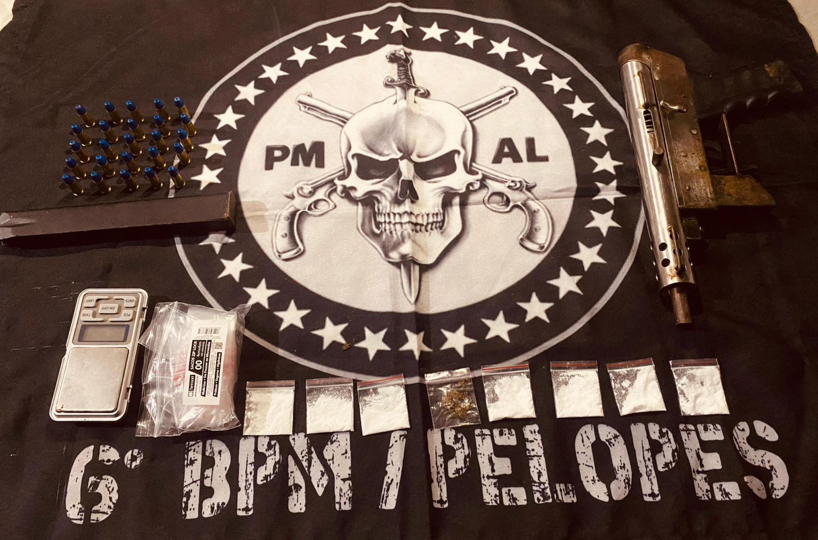 Ao ser revistado, os militares encontraram com ele uma mochila contendo uma submetralhadora artesanal calibre 9mm, um carregador com 25 munições intactas, uma balança de precisão, além de pequenas quantidades de cocaína e maconha.