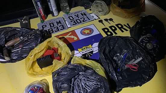 Na mochila, os PMs encontraram várias placas de veículos, diversas chaves para arrombamentos, chaves mestres, lacres, materiais para adulterações de chassi, e outros materiais com características de clonagem de motos.