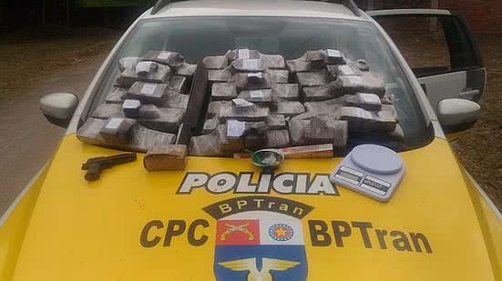 A guarnição chegou ao local e encontrou maconha com Pedro e uma quantidade visível no sofá de sua residência.
