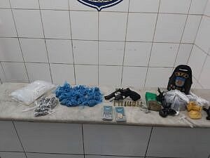 De acordo com a polícia, a prisão se deu após informação que chegou no Disque Denuncia, no 181. Com ele, foram apreendidos maconha, crack e cocaína, um revolver calibre 38 municiado e balanças de precisão.