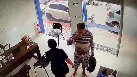 Imagens das câmeras de segurança do estabelecimento mostram o homem entrando no local e pedindo um cafezinho. Em seguida, ele faz algumas perguntas para a funcionária, abre a mochila para recolher os objetos e anuncia o assalto.