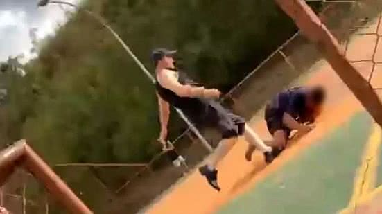 No momento em que o homem chutava o menor no chão, outras pessoas na quadra gritavam por ajuda. Logo em seguida, o suspeito deixou o local, enquanto o menino continuou deitado.