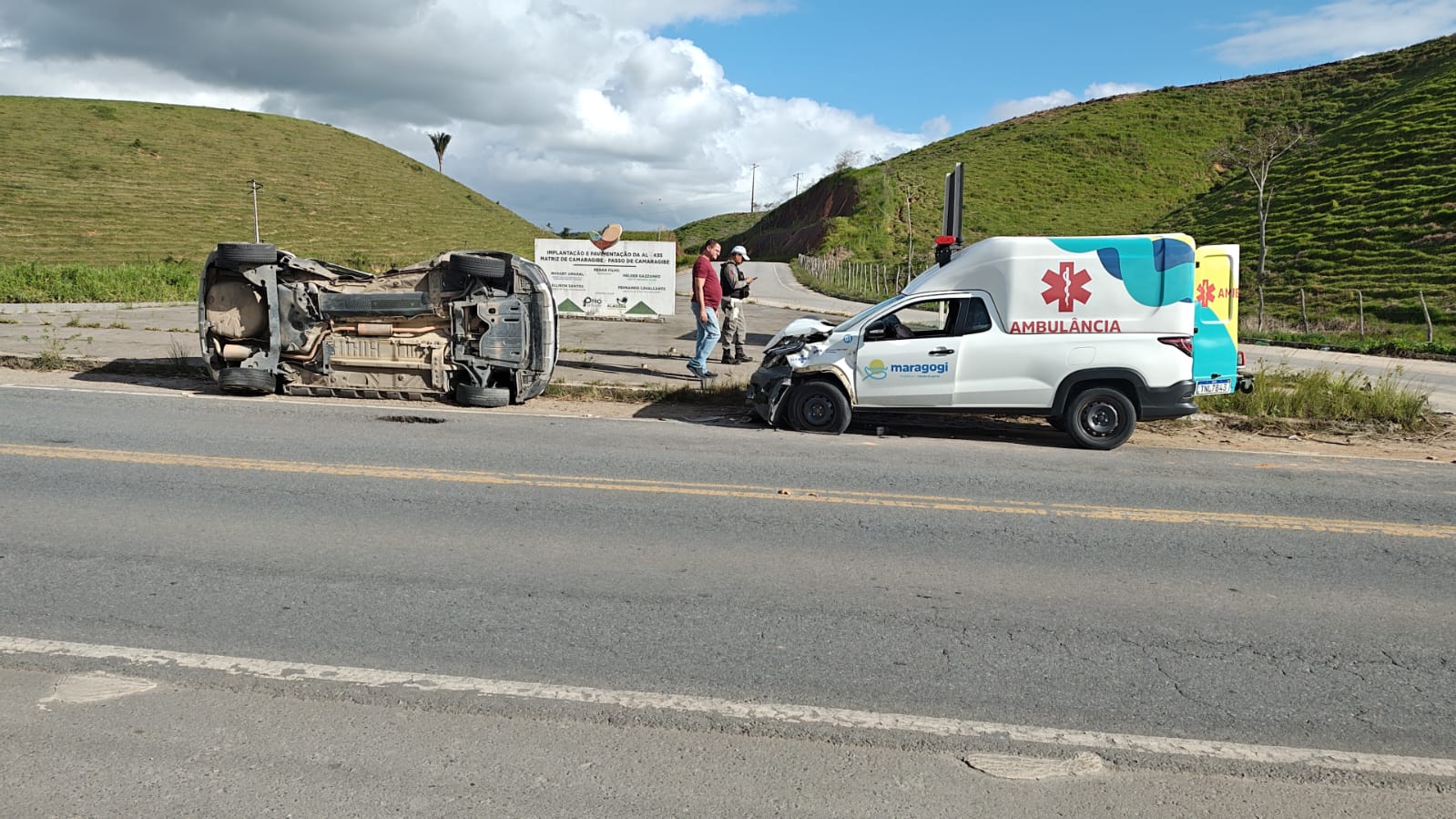 Imagens divulgadas pelo Batalhão de Polícia Rodoviária (BPRv), mostram que a parte da frente da ambulância, que seria da Prefeitura de Maragogi, ficou destruída após o acidente. Já o carro de passeio, um Sandeiro de cor branca, ficou tombado na rodovia.