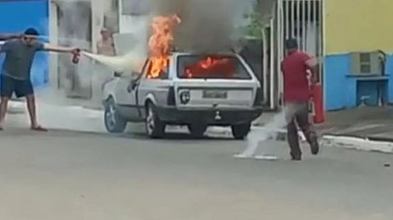 Imagens obtidas pelo g1 mostram, em outro ângulo, o veículo em chamas e várias pessoas desesperadas tentando controla-las com o uso de extintores.