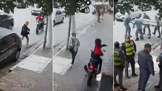 Um motoqueiro se aproxima e exige a mochila. Neste momento, o homem corre para se esconder em um comércio. As imagens mostram que o criminoso dirige pela calçada e entra a pé no comércio. Segundo a SSP, ele atirou na vítima antes de fugir com os pertences.