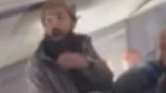 "Eu vou matar todos os homens neste avião", ele ameaça. Uma imagem mostra seis passageiros em cima de Torres tentando contê-lo.