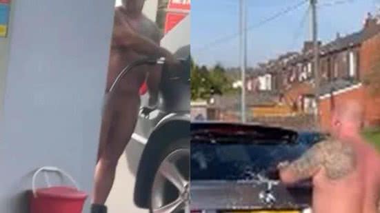 Na semana passada, uma imagem insólita viralizou nas redes sociais do Reino Unido. Um homem foi visto abastecendo o seu carro num posto de gasolina de Manchester (Inglaterra) como veio ao mundo. Aliás, quase. Ele usava botas.