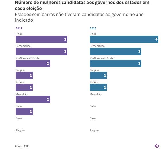 Piauí e Rio Grande do Norte foram os únicos estados do Nordeste que tiveram aumento das candidaturas femininas ao governo. Enquanto o Piauí teve três candidatas em 2018 e quatro em 2022, o Rio Grande do Norte teve duas em 2018 e três em 2022.