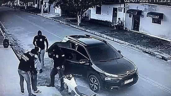 As imagens mostram a vítima chegando de motocicleta com uma criança na garupa e estacionando a moto na frente de casa, quando um veículo Citroën C4 Cactus, de cor preta, para ao lado e três homens caracterizados com roupas da Polícia Civil descem com armas em punho. Um deles está de boné e máscara, enquanto os outros dois utilizam balaclavas para esconder os rostos.