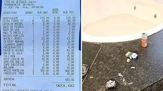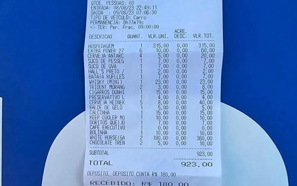 A conta mostra que três pessoas entraram no motel às 22h49 de terça-feira (8). Os dois homens tentaram sair na quarta-feira (9) por volta das 7h. (8). Os dois homens tentaram sair na quarta-feira (9) por volta das 7h.