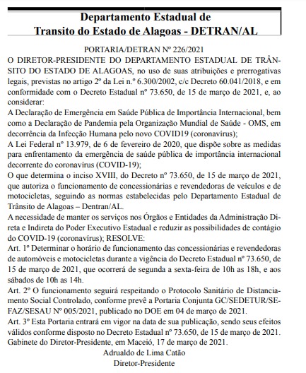 Como previsto no novo decreto do Governo de Alagoas que muda todo o estado para a Fase Vermelha a partir desta sexta-feira, o Detran-AL publicou hoje uma portaria regulamentando o funcionamento de Concessionárias de veículos e oficinas durante a vigência do Decreto Estadual nº 73.650.