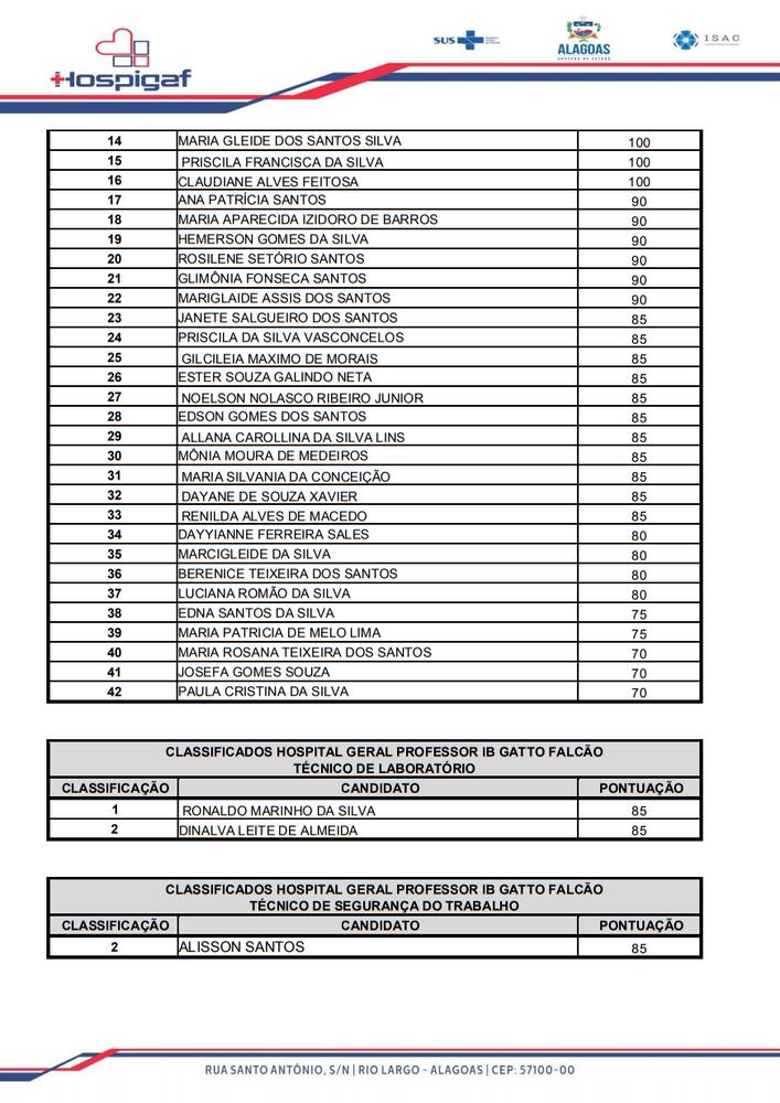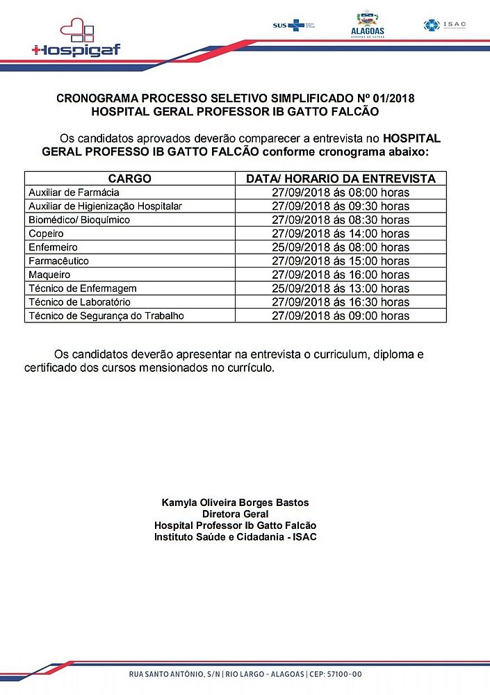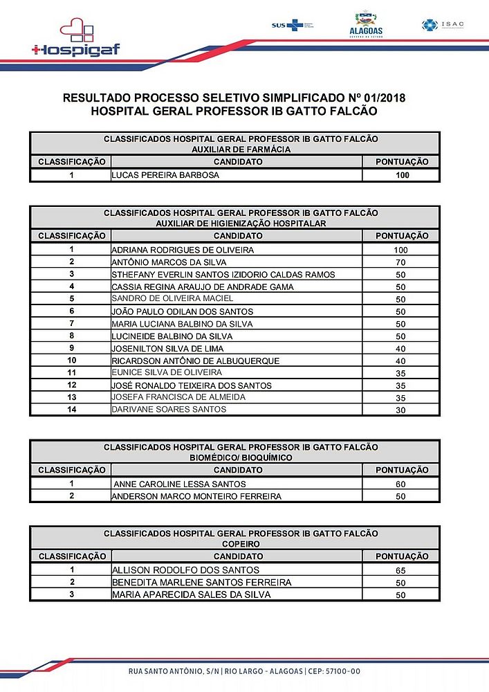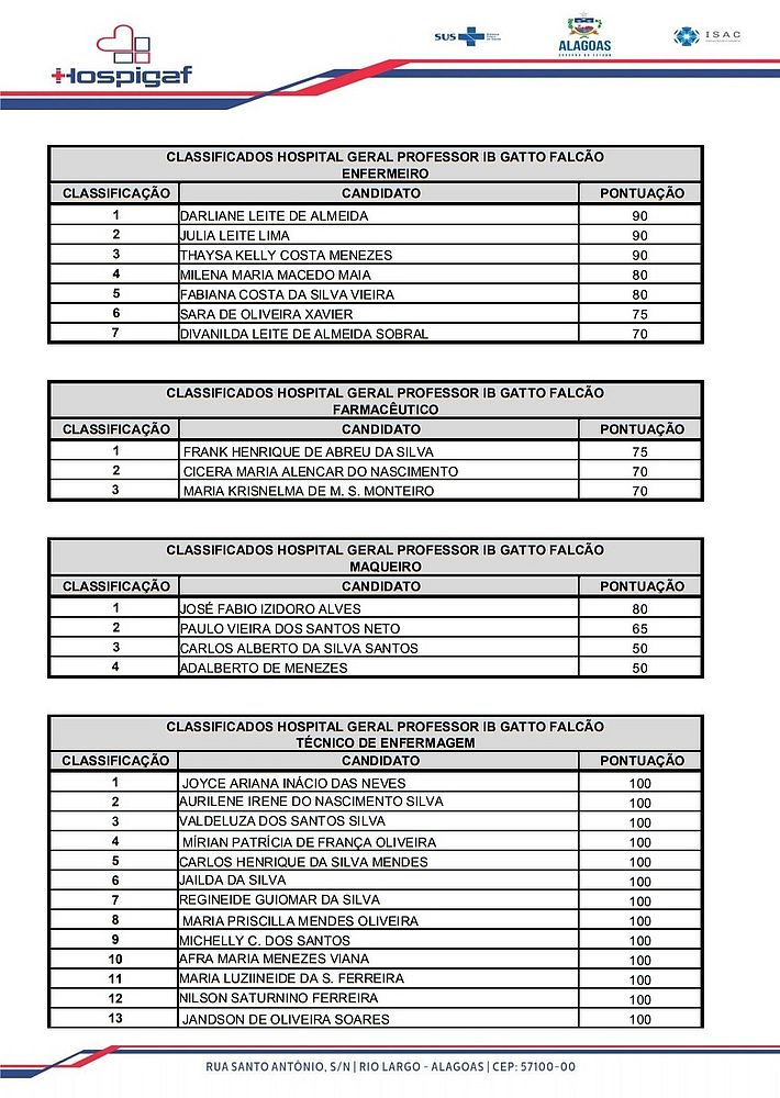 O Hospital Geral Professor Ib Gatto Falcão, localizado no município de Rio Largo, Região Metropolitana de Maceió, divulgou hoje, segunda-feira, 24 de setembro de 2018, o resultado do processo seletivo para o preenchimento de 81 vagas na unidade. Os salários chegam a até 3.043,37.