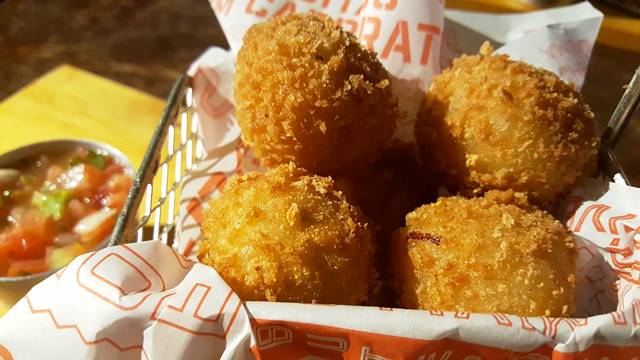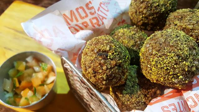 Crocantes e irresistíveis – Essa seção é dedicada às coxinhas, pasteis, bolinhos… Provei três sabores de bolinhos, o de feijoada vem recheado com pedacinhos de linguiças e em vez da farinha de trigo, é usada a goma de tapioca para dar a liga.