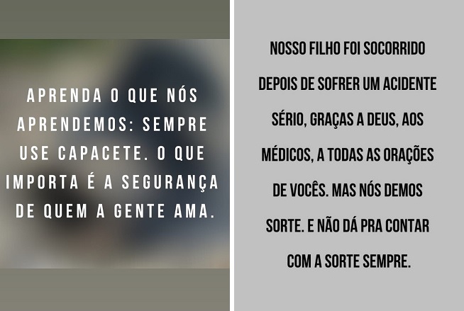 O apresentador aproveitou também para postar textos e fotos de capacetes quebrados e destacou a importância de usar o equipamento durante a prática esportiva. "Aprenda o que nós aprendemos: sempre use capacete. O que importa é a segurança de quem a gente ama", escreveu em um dos posts.