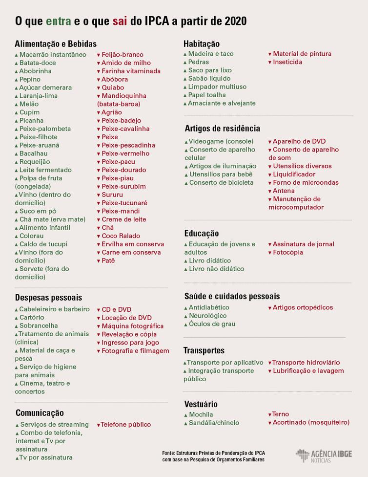 De acordo com o IBGE, 377 produtos e serviços serão analisados no novo IPCA, com a inclusão de 56 novos itens que refletem novos hábitos de consumo dos brasileiros, como transporte por aplicativo, integração transporte público, serviços de streaming e combo de telefonia, internet e TV por assinatura, além de cuidados com animais de estimação.