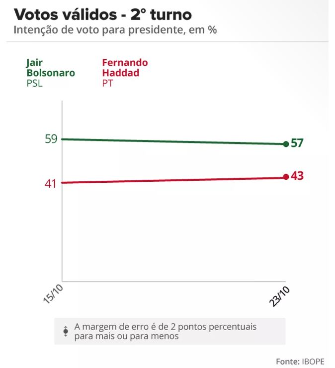 Pesquisa anterior do Ibope, divulgada em 15 de outubro, mostrou Bolsonaro com 59% dos votos válidos e Haddad, com 41%. No primeiro turno, Bolsonaro teve 46% dos votos válidos e Haddad, 29%.