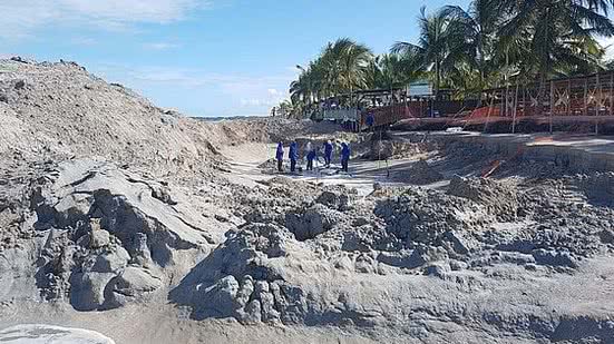 Imagens que circulam nas redes sociais mostram uma grande quantidade de areia retida após escavação na praia. Segundo o engenheiro Marco Lyra, o procedimento é necessário para a formação da nova estrutura.