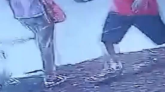 O autor do ataque à idosa ainda não foi identificado. As imagens mostram um homem de altura mediana, com tênis, bermudas escuras e camiseta vermelha, mas o rosto dele não aparece com clareza.