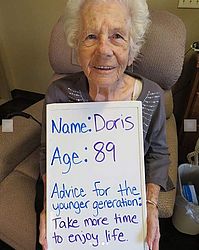 “Tenha mais tempo para apreciar a vida”, diz a placa de dona Doris, de 89.