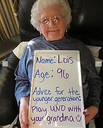 Dona Lois, de 96 anos faz um convite a quem tem vovó: “Jogue UNO com sua avó”.