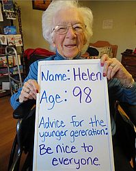“Seja gentil com todo mundo”, mostra a placa de dona Helen, de 98 anos.