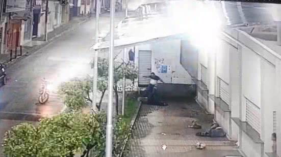 O homem se afasta e deixa o idoso no chão, aparentemente desacordado. Ele e a mulher sobem na moto e vão embora. Em menos de um minuto, o casal volta a aparecer na imagem, no canto superior esquerdo do vídeo.