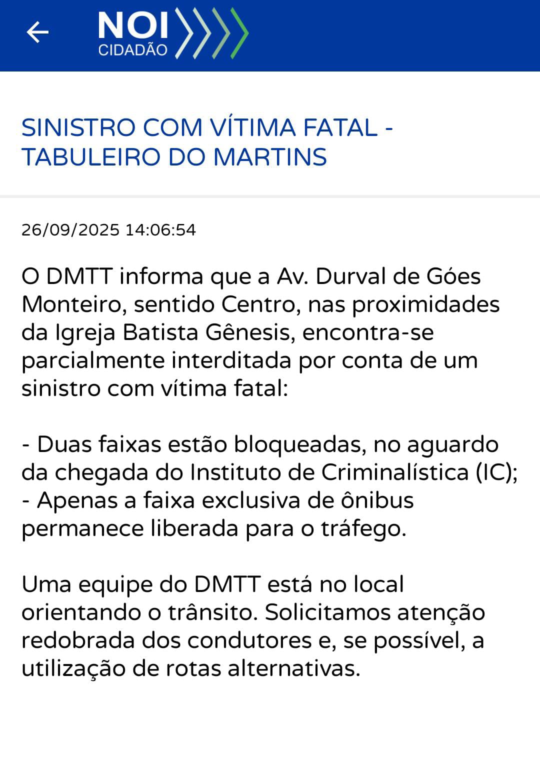 Um homem de 73 anos morreu após ser atropelado por uma motocicleta, na tarde desta sexta-feira (26), na Avenida Durval de Goes Monteiro, no Tabuleiro do Martins, na parte alta da capital alagoana. De acordo com informações da reportagem da TV Pajuçara, o condutor da moto foi socorrido em estado grave.