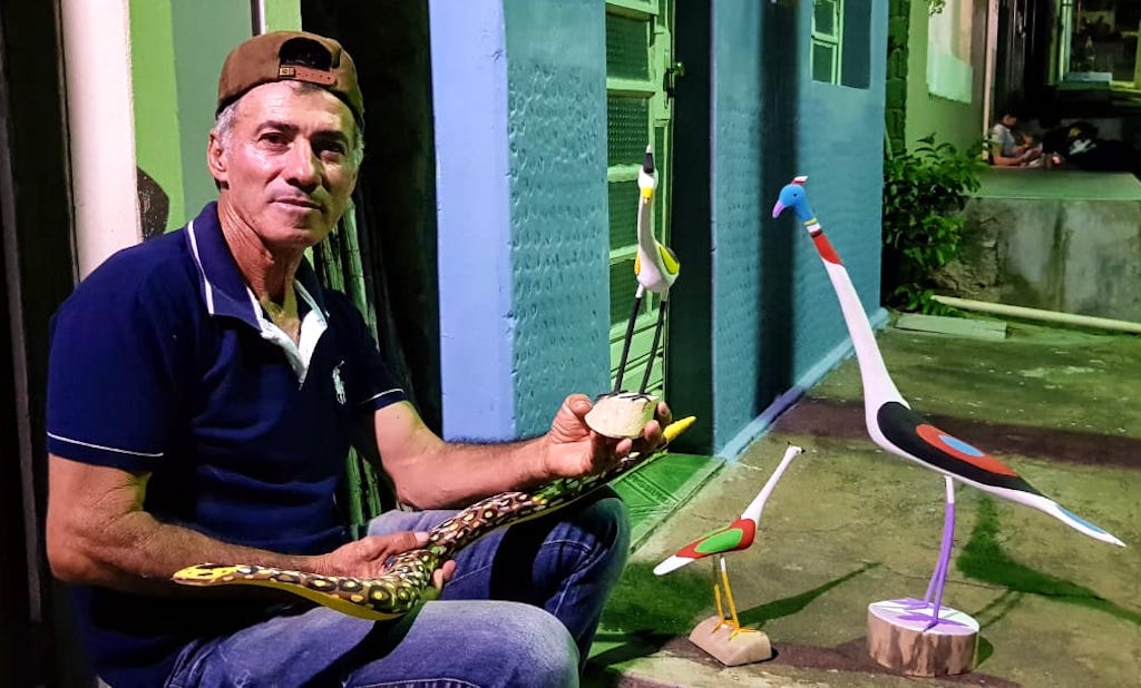 Na casa do artesão Dedé com a placa “Aqui tem Artesanato Feito A Mão”