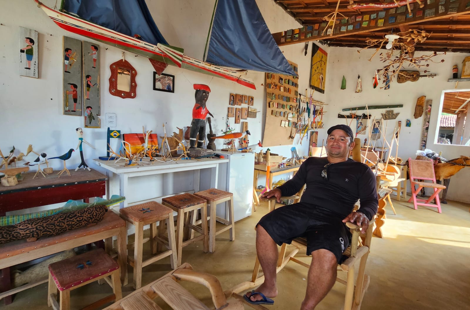 Dedé no seu atelier na Ilha do Ferro onde reúne artistas de Pão de Açúcar, Olho D´água do Casado e Poço Redondo (Sergipe)