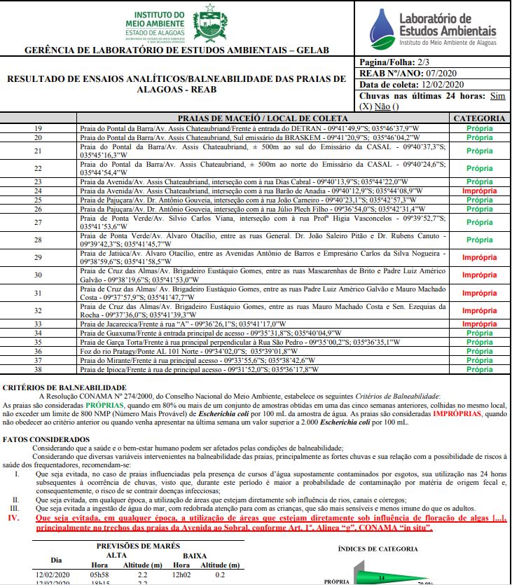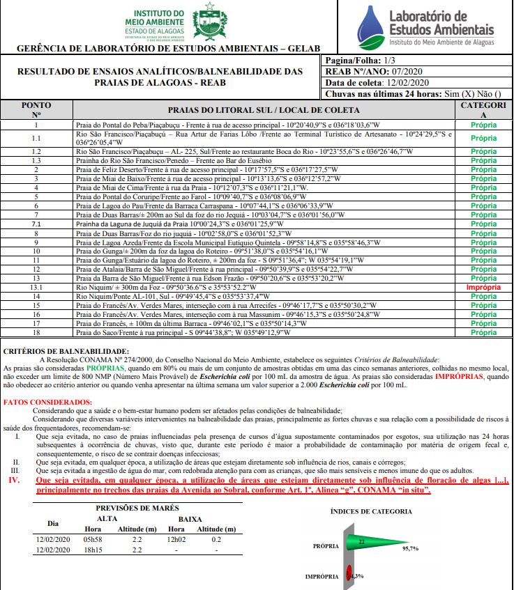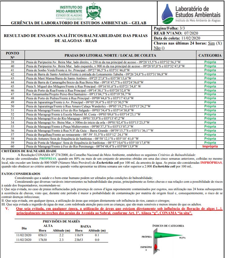 O relatório de balneabilidade é um documento semanal produzido com base no que recomenda a resolução 274/2000 do Conselho Nacional de Meio Ambiente (Conama). As praias são consideradas próprias para banho quando em 80% do conjunto de amostras, colhidas no mesmo no local, não exceder o limite de 800 NMP (Número Mais Provável) da bactéria E.coli em cada 100mL de água coletada.