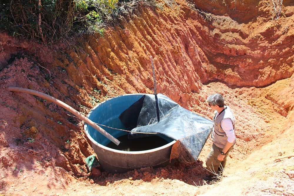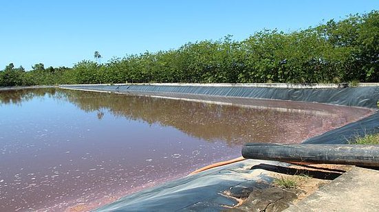 A lagoa foi construída para receber o excedente do chorume bruto gerado no aterro, ela chama atenção porque está fora da área das demais lagoas. No local a equipe encontrou um buraco recém-escavado, na propriedade adjacente ao aterro, para drenar o chorume que estava vazando direto da lagoa, possivelmente devido a alguma infiltração.