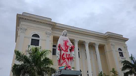 A imagem de Nossa Senhora das Graças foi alvo de vandalismo, na madrugada desta quarta-feira, 30, em frente ao prédio da Associação Comercial, no bairro de Jaraguá, parte baixa de Maceió.