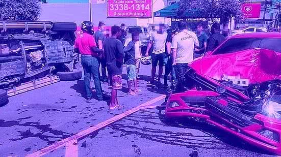 Conforme é possível ver nas imagens, (vídeo abaixo), o acidente envolveu uma Mitsubishi Pajero Sport, de cor preta, e um Golf, de cor vermelha, que ficou com a parte frontal totalmente destruída.