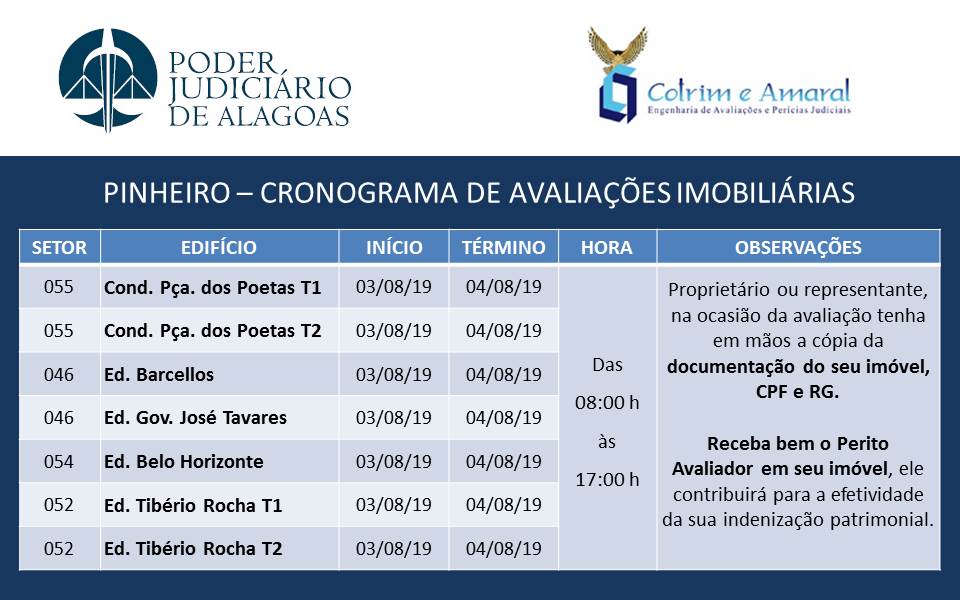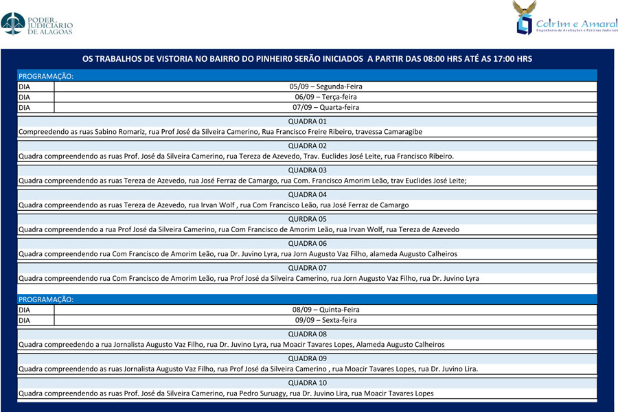 As vistorias estão sendo realizadas pela empresa Cotrim e Amaral Engenharia de Avaliações e Perícias Judiciais, designada pelo TJAL.
