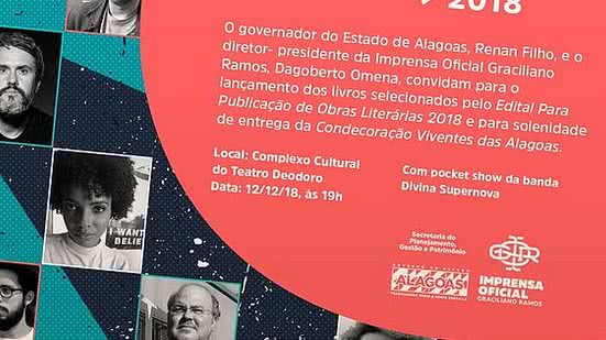 A Imprensa Oficial Graciliano Ramos lança onze livros inéditos, selecionados a partir do Edital Para Publicação de Obras Literárias 2018 - um dos editais públicos mais aguardados pelos escritores contemporâneos de Alagoas. Do conjunto de onze autoras e autores selecionados este ano, sete estão realizando o sonho de publicar os primeiros livros de suas carreiras: Ana Iris Santos, Cid Brasil, Fátima Costa, Felipe Benício, João Gomes, Karen Pimentel e Natasha Tinet. Entre os experientes, estão alguns autores que já fazem parte do elenco da editora. São elas e eles: Amanda Prado, Sara Albuquerque, Sidney Wanderley e Wado. O evento de lançamento, gratuito e aberto ao público, será realizado no dia 12 de dezembro, às 19h, no Complexo Cultural do Teatro Deodoro. Além da sessão de autógrafos, haverá o anúncio de três novos editais e a apresentação da banda Divina Supernova.