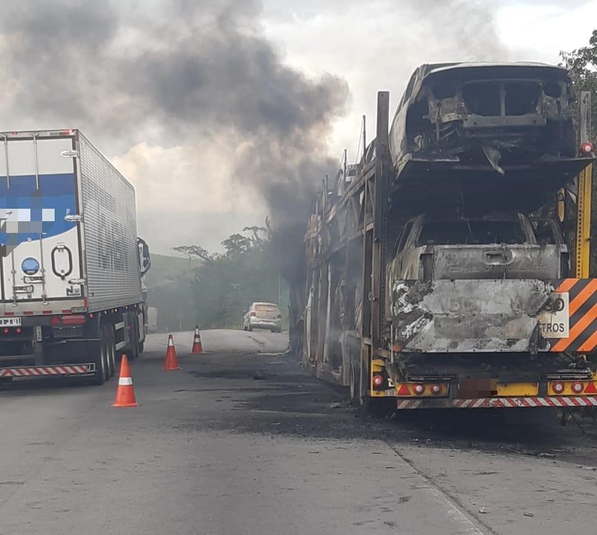 Um caminhão-cegonha carregado com oito picapes Chevrolet S-10 pegou fogo, na tarde desta quarta-feira, 25, na BR-101, em Novo Lino, na Zona da Mata alagoana. Algumas imagens divulgadas pelas Polícia Rodoviária Federal (PRF) mostram que os veículos foram destruídos pela chamas. Apesar do susto, não houve feridos.