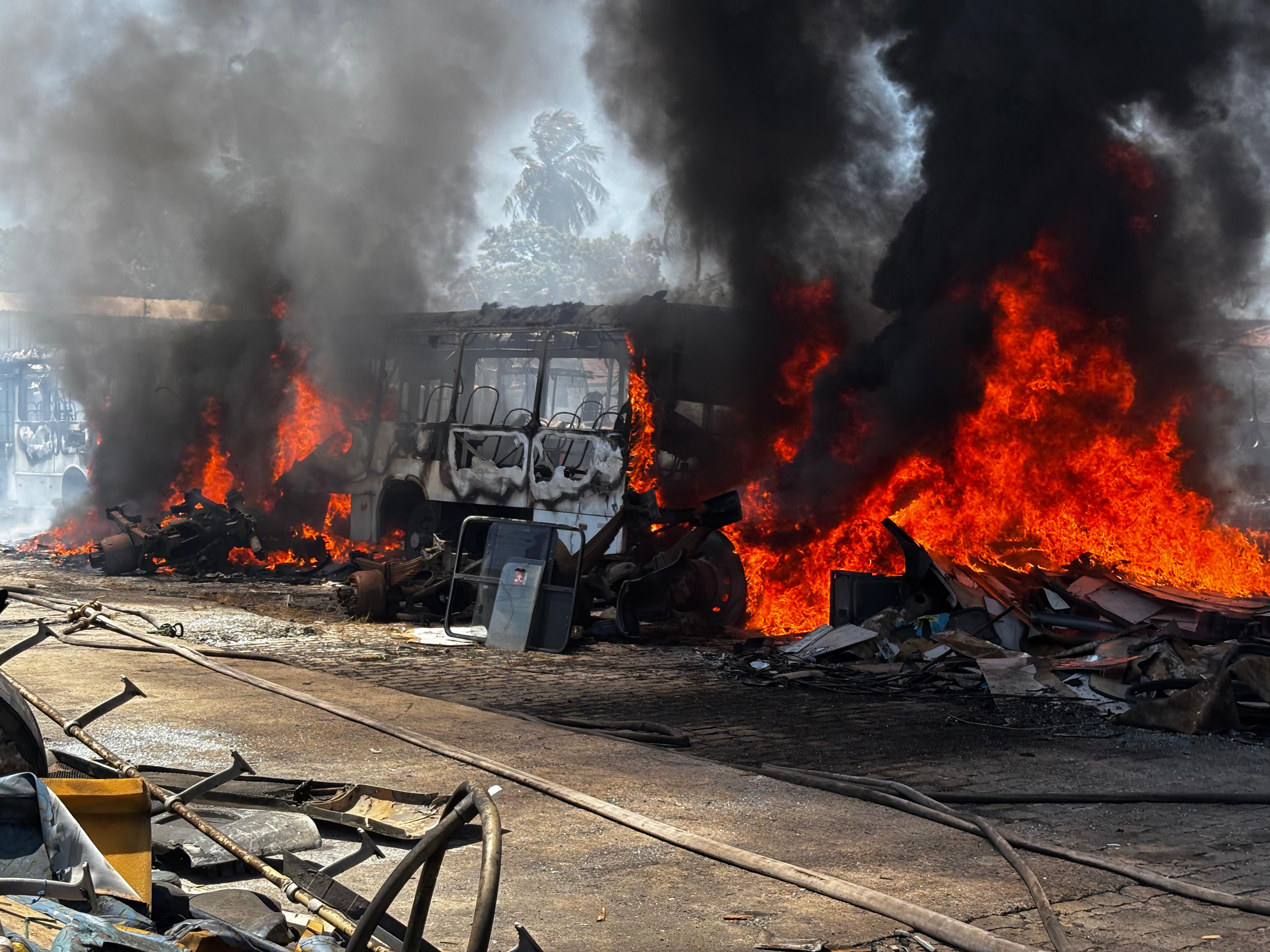 Ao menos seis ônibus ficaram completamente destruídos e outros três comprometidos parcialmente em um incêndio de grandes proporções na garagem da empresa Veleiro, no bairro Trapiche da Barra, em Maceió, na manhã desta segunda-feira (30).