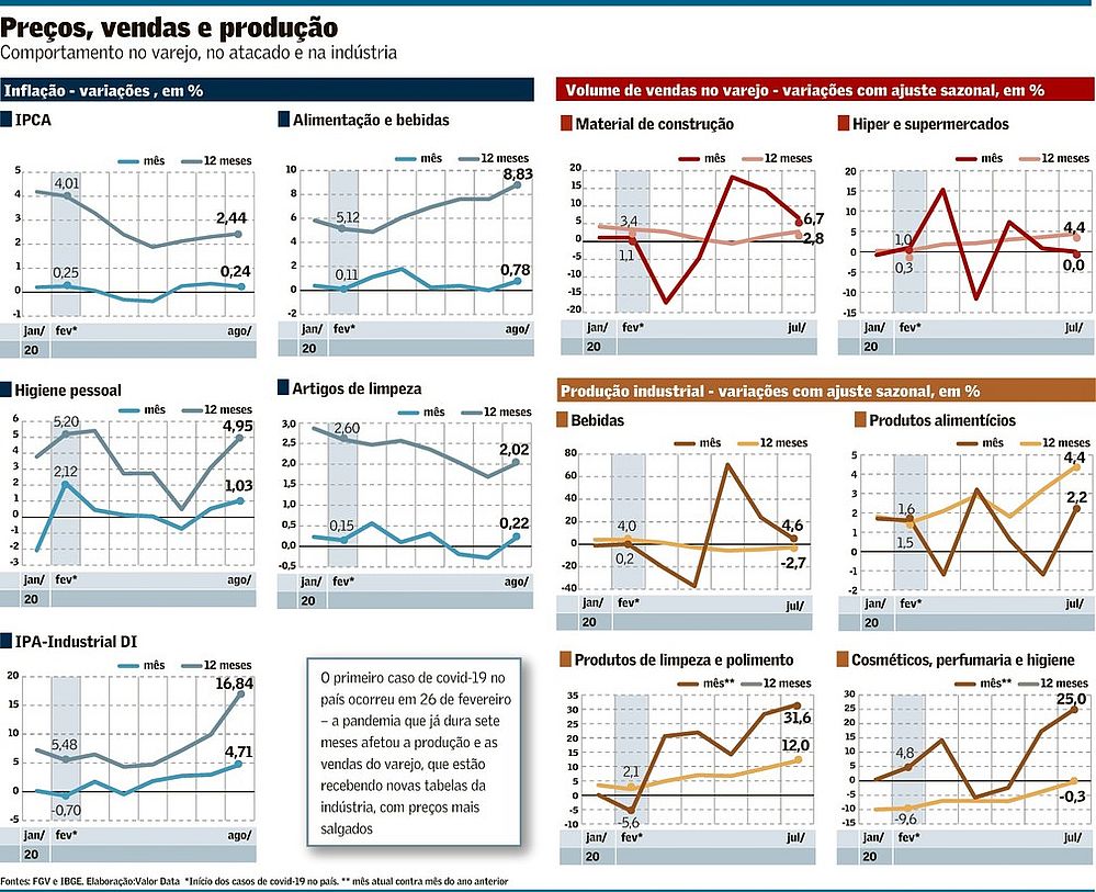 O movimento de alta nos preços já está sendo captado pelos índices de inflação. O IPCA, medido pelo IBGE, teve em agosto a maior elevação para o mês desde 2016 - de janeiro a agosto deste ano, a taxa sobe 0,70% e em 12 meses, 2,44%. Já o IGP-M, que reflete a variação dos preços no atacado, acumula alta de 9,64% no ano até agosto e de 13,02% em 12 meses, reflexo da alta das commodities e dólar forte.