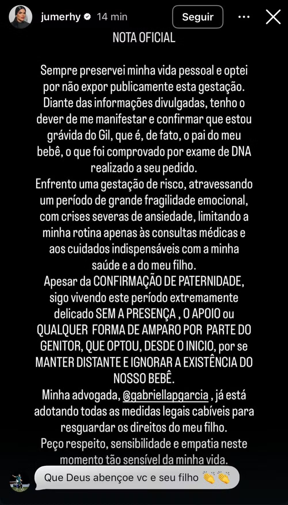 "Sempre preservei minha vida pessoal e optei por não expor publicamente esta gestação. Diante das informações divulgadas, tenho o dever de me manifestar e confirmar que estou grávida do Gil, que é, de fato, o pai do meu bebê, o que foi comprovado por exame de DNA realizado a seu pedido. Enfrento uma gestação de risco, atravessando um período de grande fragilidade emocional, com crises severas de ansiedade, limitando a minha rotina apenas às consultas médicas e aos cuidados indispensáveis com a minha saúde e a do meu filho", postou Juliana nas redes sociais.