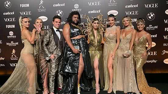 Gabriela Sales, a Rica de Marré, também triunfou no evento da revista de moda mais importante do mundo. Ela escolheu um vestido e uma sandália dourados, mas o que chamou a atenção mesmo foi o emaranhado de cobras que emergiam dos ombros, desciam pelo busto enquanto outras subiam, formando uma escultura na cabeça.
