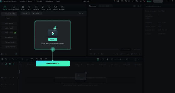 Vá até a área de trabalho e abra o software clicando no ícone. Uma janela será aberta, onde deve selecionar a opção “novo projeto”. No novo espaço, você perceberá uma “linha do tempo” (na parte inferior) e um campo para a importação de mídias. Clique nesse espaço e selecione os seus materiais.