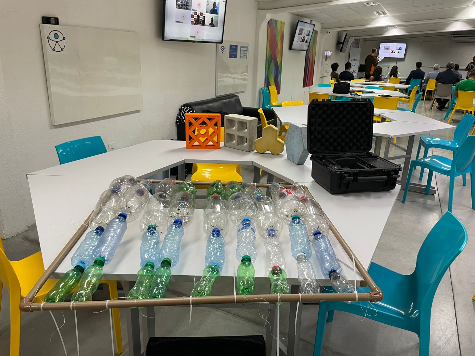 Dentro do Oceano de Plástico, a startup Policoncret foi criada para executar as ações do projeto. Clarissa Soares é engenheira do núcleo e conta que a empresa surgiu no intuito de dar um novo valor aos resíduos plásticos. "Fazemos um reaproveitamento através da reciclagem, onde a gente substitui parcialmente a brita e a areia, que são os agregados do concreto, produzindo um concreto sustentável. E a partir disso, nós fazemos artefatos, são mesas, bancos, cobogós, pisos intertravados, materiais de caráter não estrutural, até o momento. Com isso, nós estamos reduzindo as emissões de gases de efeito estufa e também a questão da pegada de carbono", explicou.
