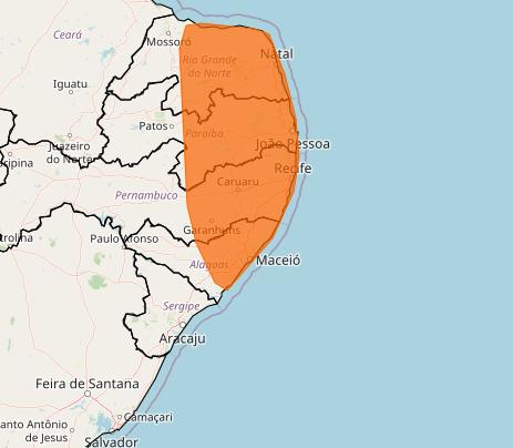 Além de Alagoas, Pernambuco, Paraíba e Rio Grande do Norte estão inseridos no alerta laranja. Foto: Reprodução/Inmet