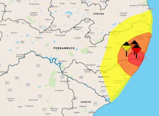 Os municípios que podem ser mais castigados pela água durante este período são: Campestre, Colônia Leopoldina, Jacuípe, Japaratinga, Maragogi, Jundiá, Novo Lino e Porto Calvo. O alerta está inserido no mapa na cor vermelha (Veja abaixo no link).