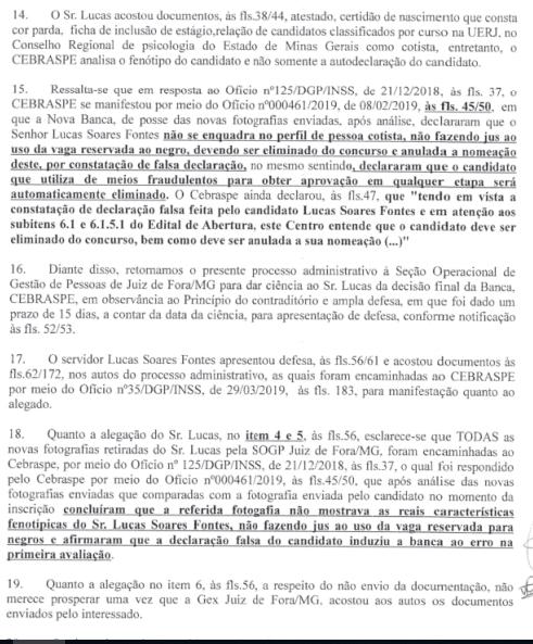 O ex-técnico do seguro social teve assegurado o seu direito à ampla defesa. Ao INSS, apresentou documentos que apontavam sua autodeclaração como negro. No entanto, a versão não foi acatada, uma vez que o Cebraspe considera o fenótipo do candidato: