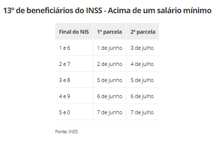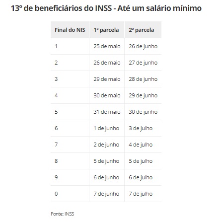 Para quem recebe até um salário mínimo, as parcelas começarão a ser liberadas a partir de 25 de maio e de 25 de junho. Para os demais, a liberação ocorrerá a partir de 1º de junho, seguindo o calendário de acordo com o número final do benefício.