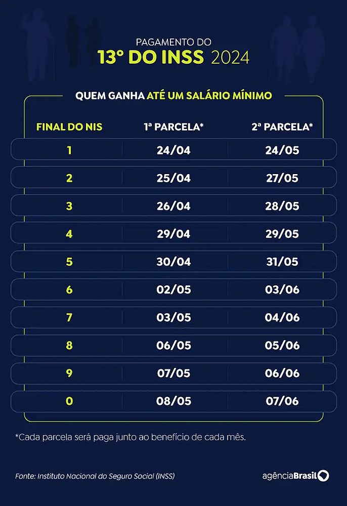 O pagamento do décimo terceiro a quem ganha um salário mínimo começou no último dia 24 e também vai até o dia 8. Até o fim desta semana, mais de 33,6 milhões de segurados receberão a primeira parcela, ao somar os que ganham o benefício mínimo e os que recebem acima dele.