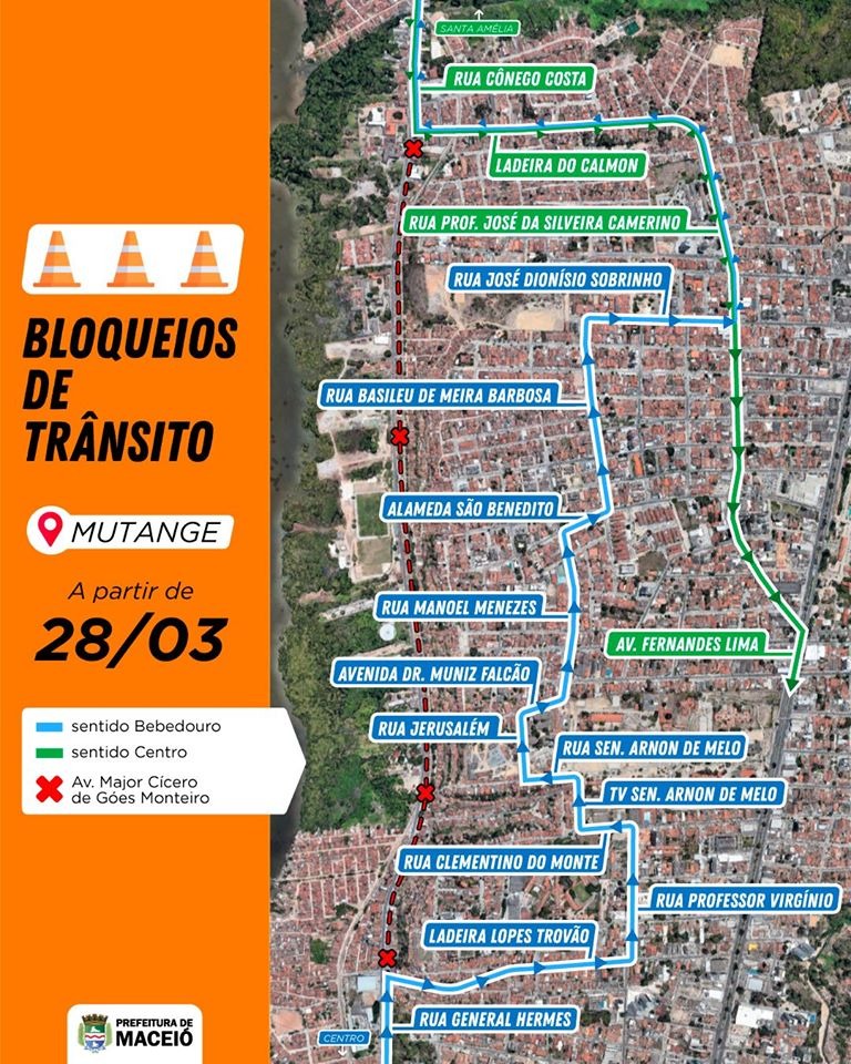 Com os bloqueios, os condutores que vierem do bairro da Santa Amélia e chegarem à Avenida Major Cícero de Góes Monteiro, em frente à Sociedade Nossa Senhora do Bom Conselho, deverão obrigatoriamente virar à esquerda e acessar a Rua Doutor Passos de Miranda (Ladeira do Calmon). A partir deste ponto, os motoristas deverão seguir pela Rua Professor José da Silveira Camerino (antiga Belo Horizonte) e seguir até a Avenida Fernandes Lima, no bairro do Farol, de onde deverão continuar com o percurso até o seu destino final.